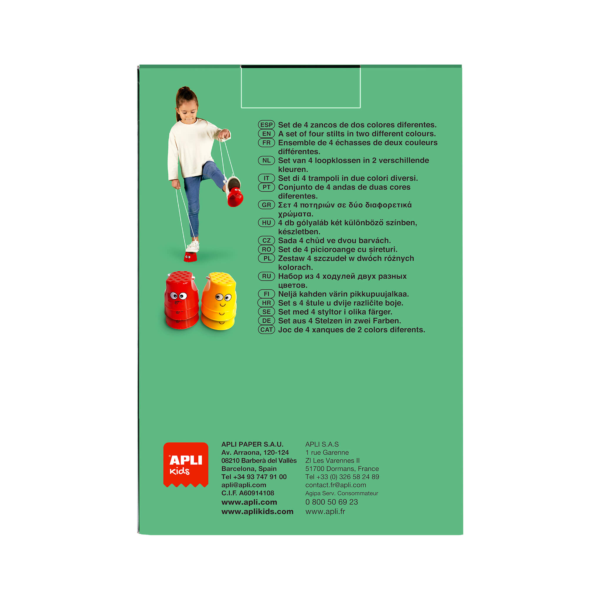 Le jeu contient 2 échasses jaunes, 2 échasses rouges et 1 sac pour ranger le jeu.