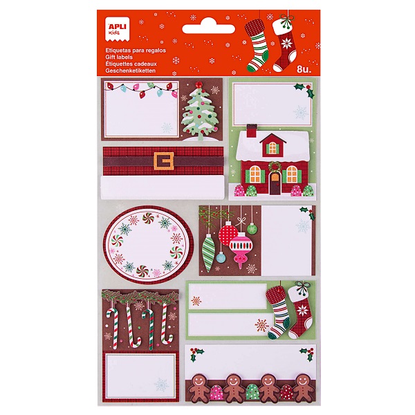 Étiquettes de Noël adhésives pour cadeaux, modèle Arbres de Noël. Chaque pochette contient 1 feuille d'étiquettes. Chaque feuille contient 8 étiquettes de dimensions assorties. Étiquettes adhésives permanentes de haute qualité, idéales pour marquer et identifier les cadeaux, rédiger des dédicaces, etc.