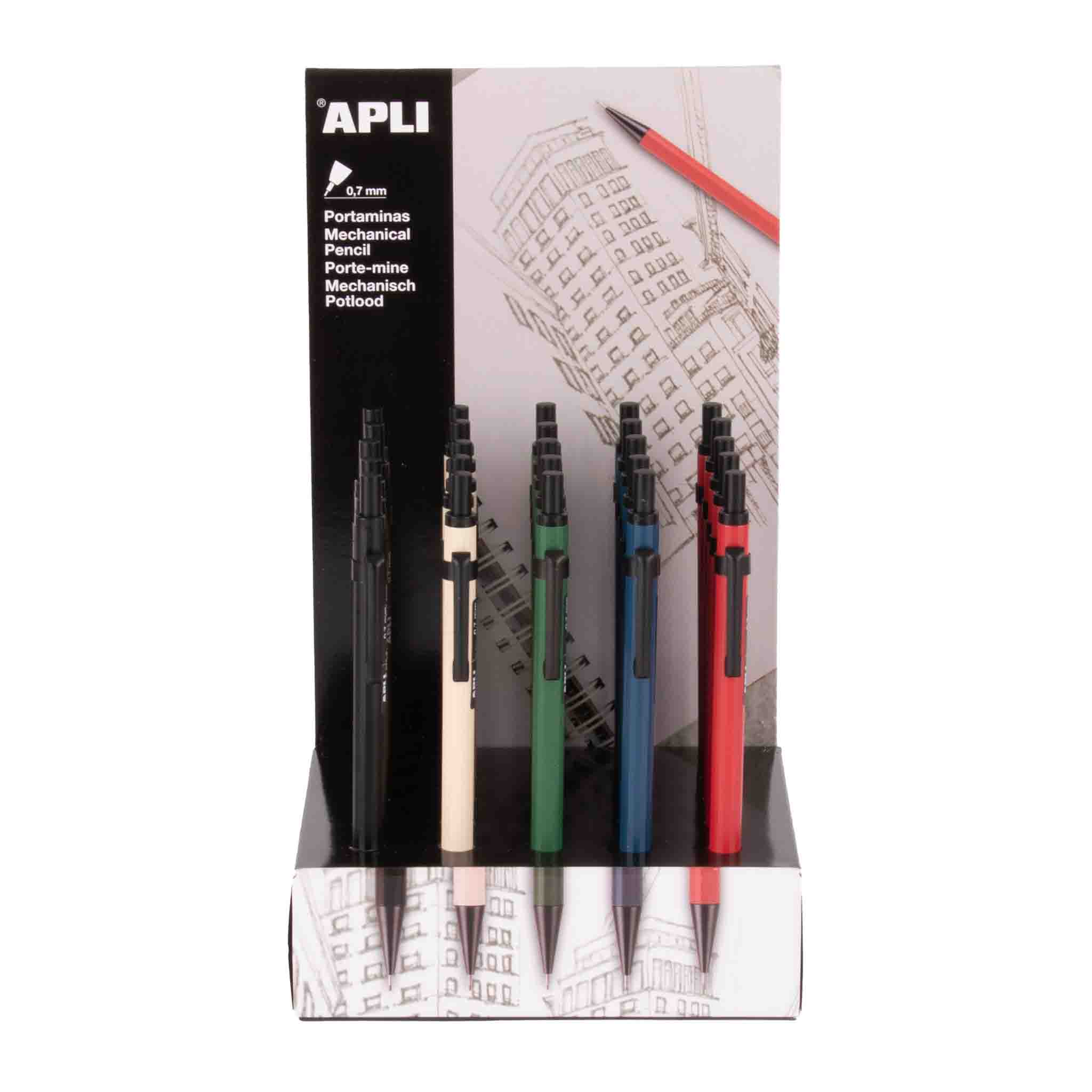 Le présentoir comprend 25 porte-mines de 5 couleurs différentes : noir, vert, beige, bleu & rouge.
