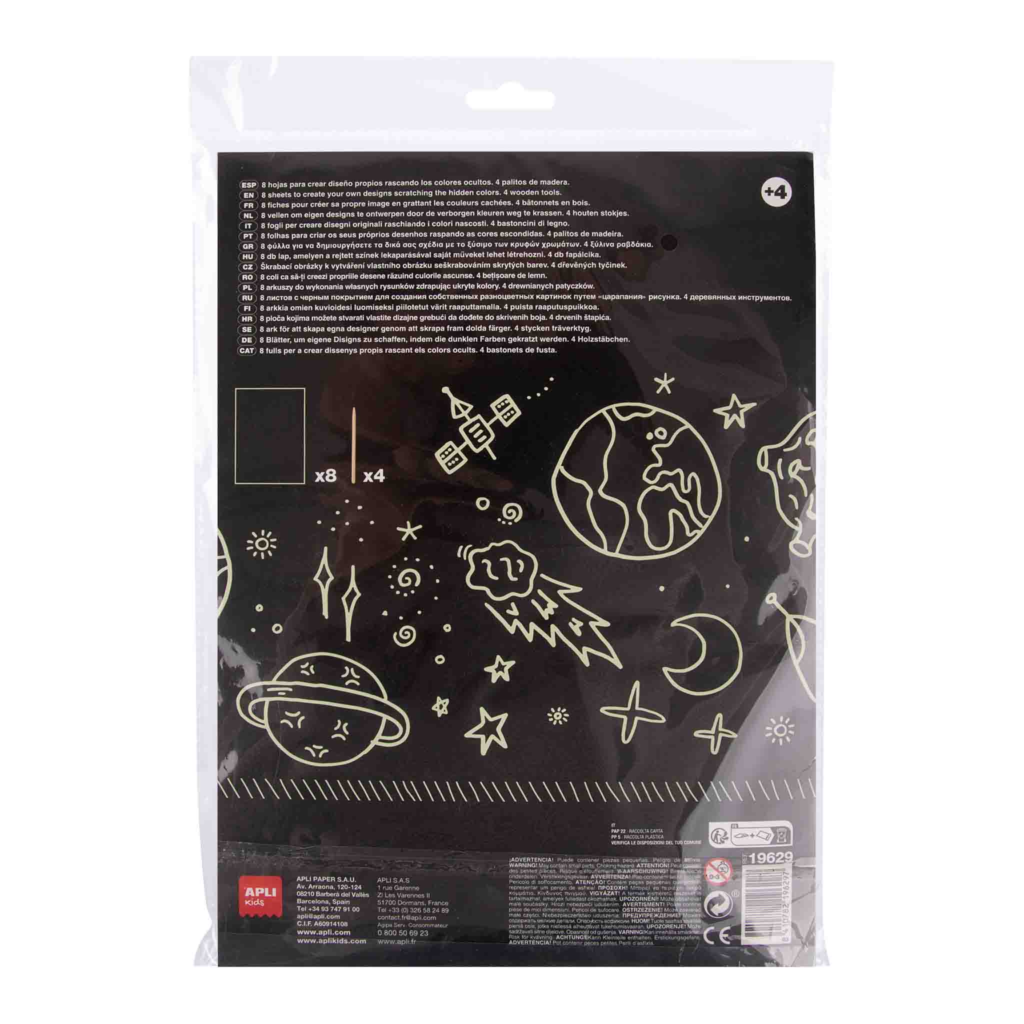 Pack de cartes à gratter luminescentes "Magic Scratch Glow in the dark" au format A4 (210 x 297 mm). Chaque blister contient 8 feuilles et 4 bâtonnets en bois comme outils à gratter. Il vous permet de créer vos propres dessins en grattant et en découvrant les différentes couleurs cachées. Éteignez ensuite la lumière et observez comment les dessins brillent dans le noir.