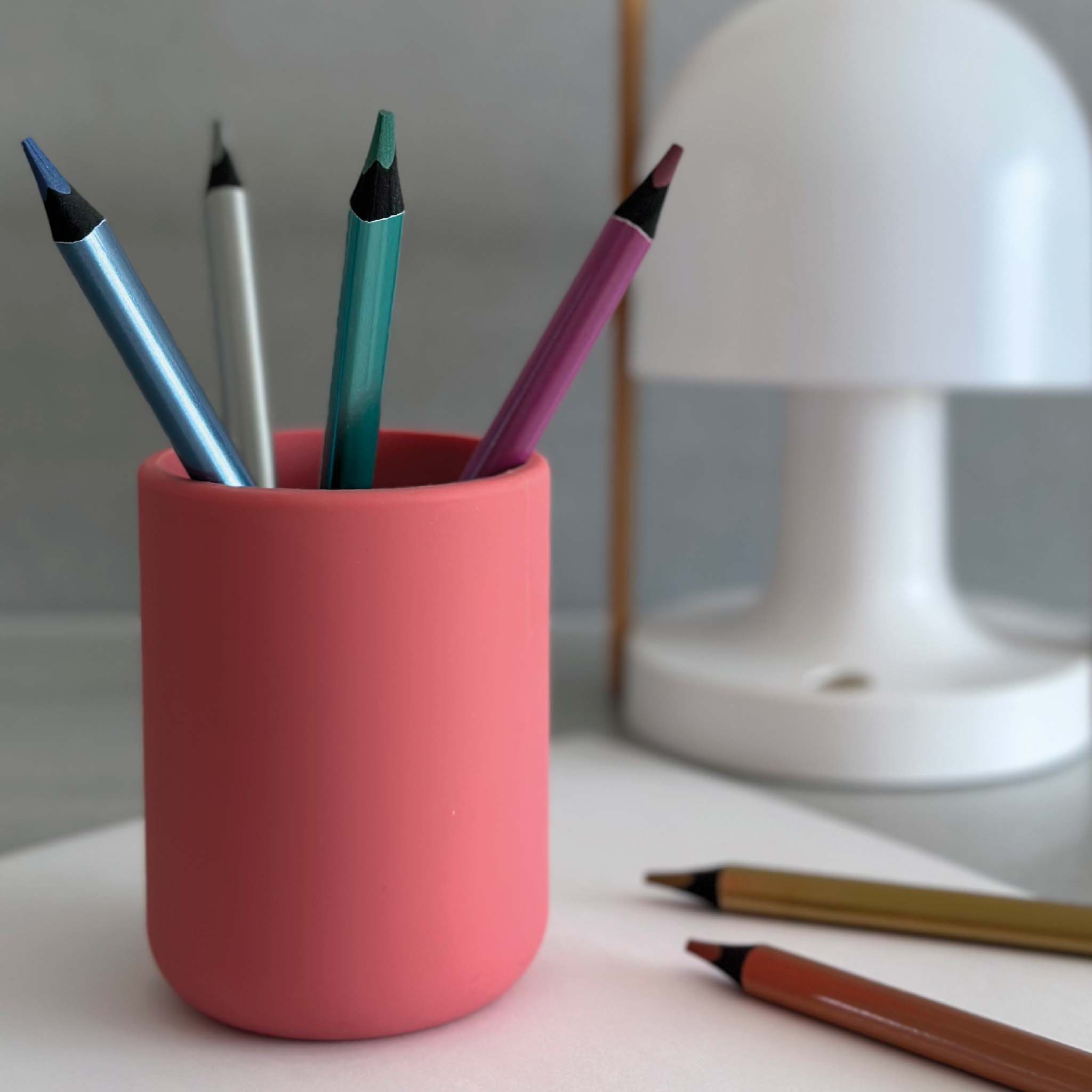 Le présentoir contient 12 pots à crayons de couleurs différentes : rose, vert, beige et bleu gris.