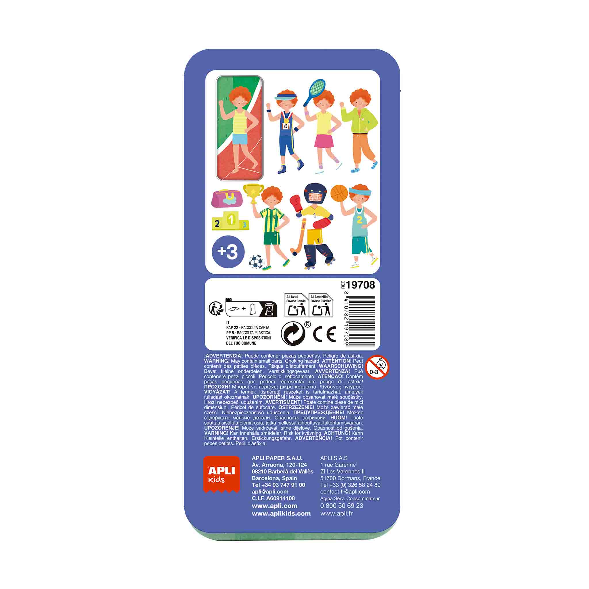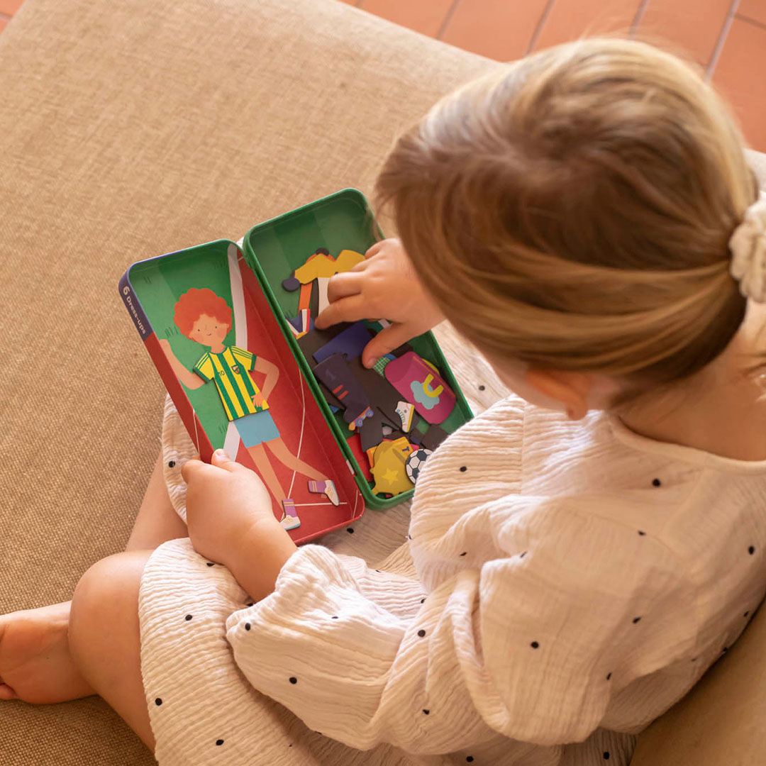 Boîte métallique pour mélanger et assortir différents vêtements et éléments de décoration sur le thème du sport.La boîte métallique à des dimensions de 30 x 32 x 203 mm, idéale pour les emporter partout où vous le souhaitez. Chaque boîte contient 30 aimants à placer. Habillez les personnages autant de fois que vous le souhaitez !Jeu à haute valeur pédagogique : encourage l’observation et l’imagination, augmente la concentration, l'attention et suscite un intérêt pour des objets, des animaux et des personnages qui leur sont inconnus. Recommandé pour les 3 ans et plus.