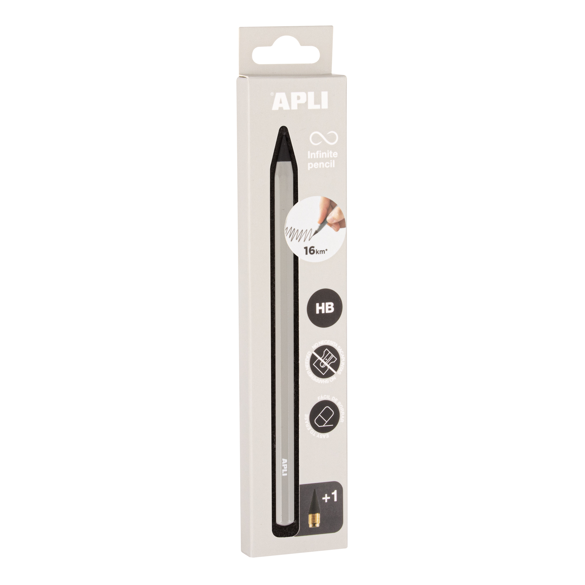 Crayon infini dans un blister gris. Crayon qui vous permet d'écrire sans vous arrêter. Grâce à sa mine légèrement abrasive et résistante, le crayon innovant Infini vous permettra d'écrire jusqu'à 16 km sans taillage, vous offrant ainsi une concentration optimale lors de vos activités d'écriture et de dessin. Chaque blister contient 1 crayon Infini, 1 mine de crayon HB et 1 capuchon de protection.