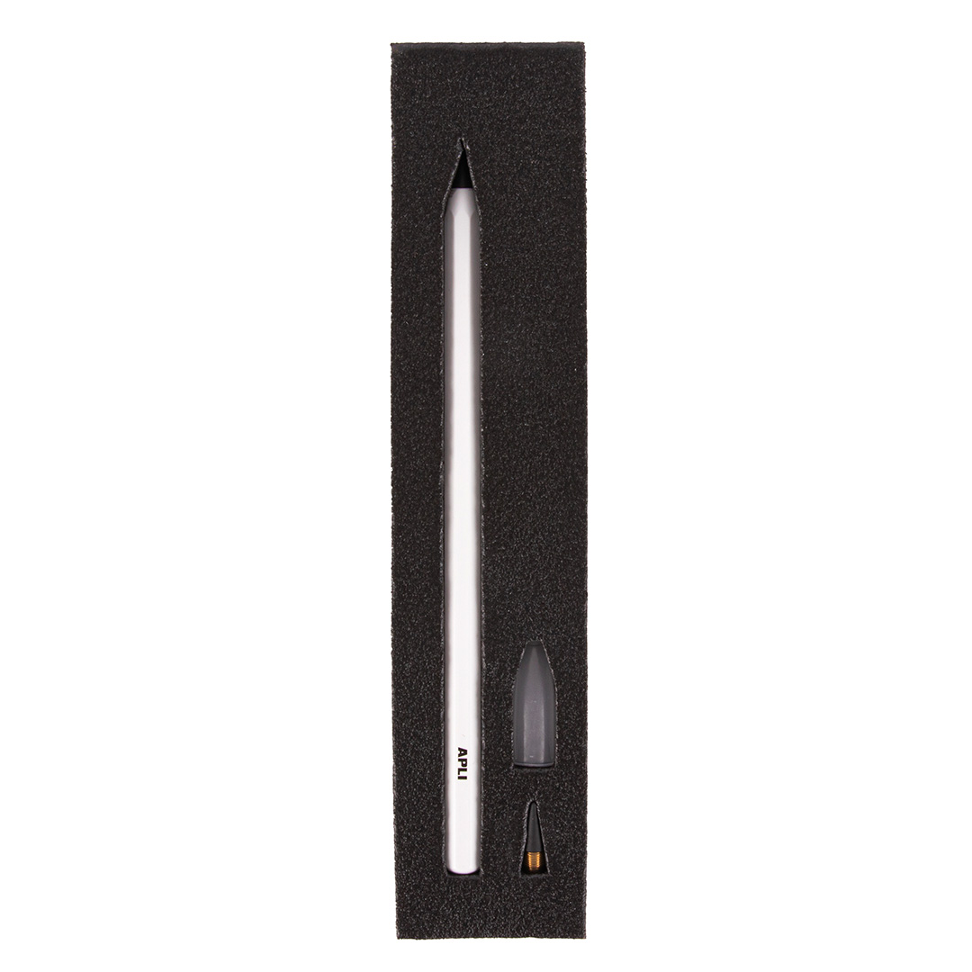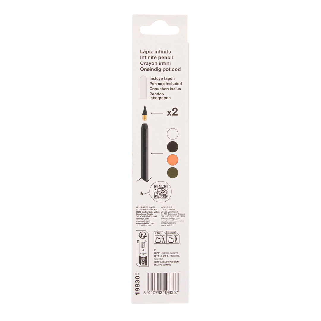 Crayon infini dans un blister blanc. Crayon qui vous permet d'écrire sans vous arrêter. Grâce à sa mine légèrement abrasive et résistante, le crayon innovant Infini vous permettra d'écrire jusqu'à 16 km sans taillage, vous offrant ainsi une concentration optimale lors de vos activités d'écriture et de dessin. Chaque blister contient 1 crayon Infini, 1 mine de crayon HB et 1 capuchon de protection.