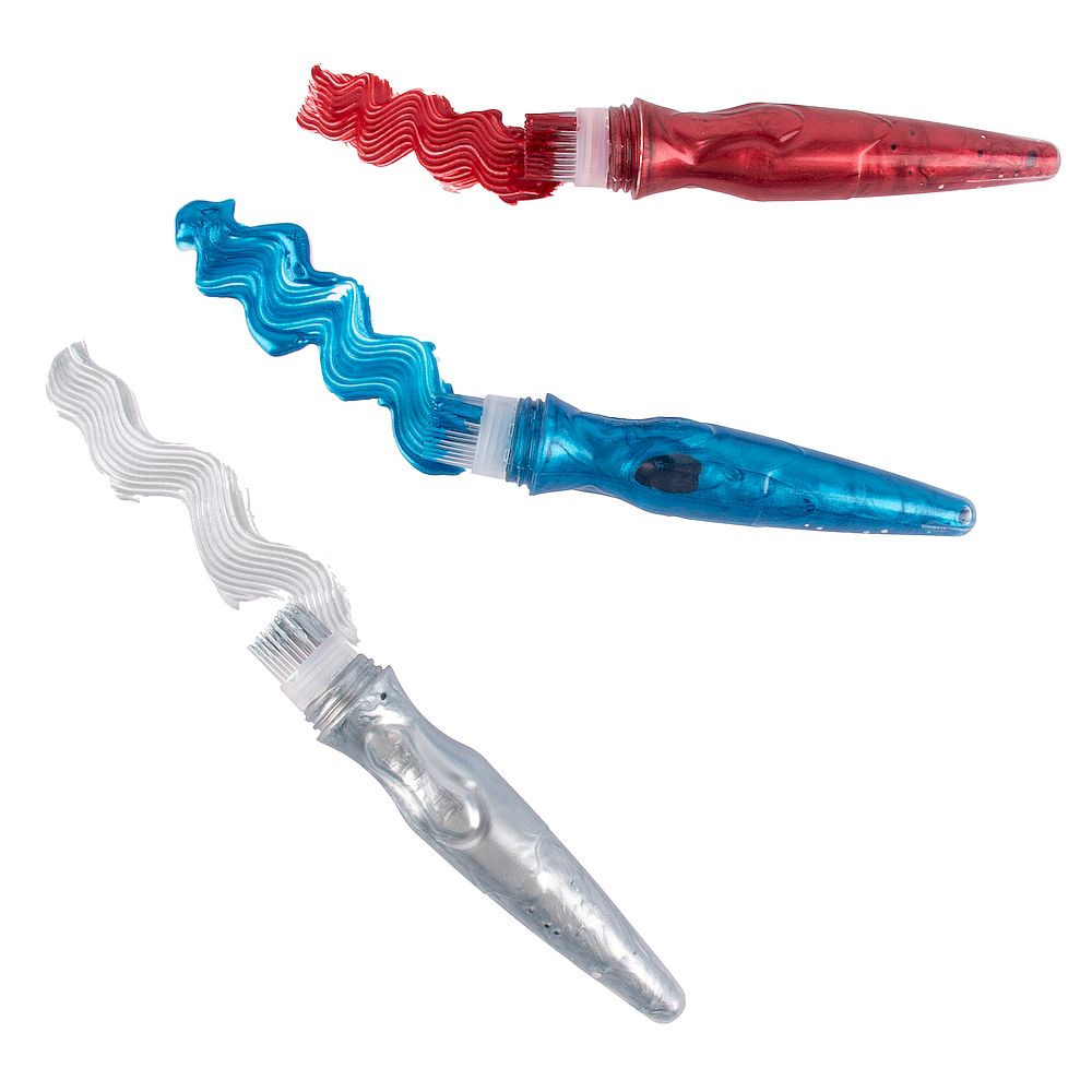 Peinture en tube avec pinceau qui permet de peindre avec précision avec des couleurs métalliques : lilas, vert, bleu, argent, or et rouge.