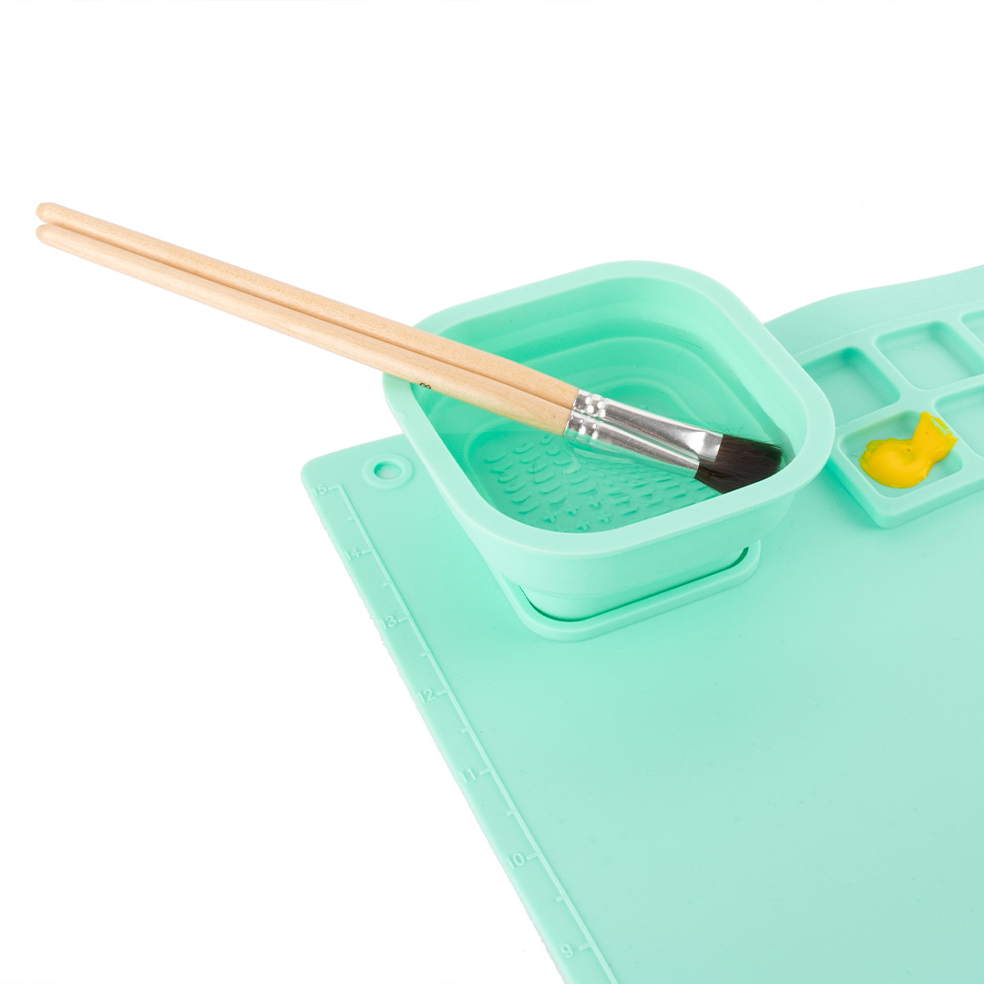 Sa surface anti-dérapante empêche le mouvement, offrant une plus grande sécurité, et sa conception flexible facilite le stockage et le transport. Le gobelet pliable inclus vous permet de laver facilement vos pinceaux et de garder votre espace bien rangé. Parfait pour peindre et créer toutes sortes de créations !