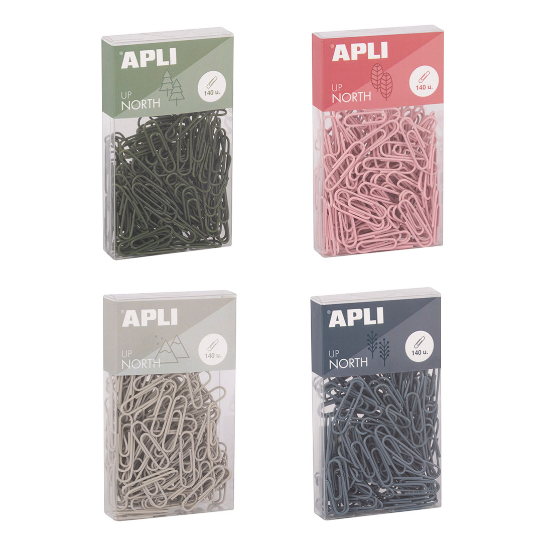 Le présentoir contient 32 boîtes, 16 de pinces à clip et 16 de trombones. Les deux modèles sont disponibles en 4 couleurs assorties : kaki, rose, gris et bleu gris. La boîte de trombones comprend 140 unités et la boîte de pinces à clip 15 unités.