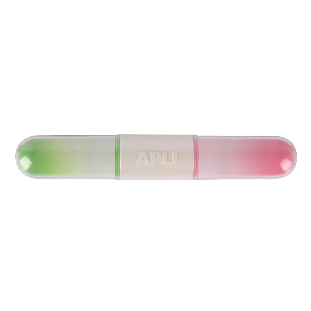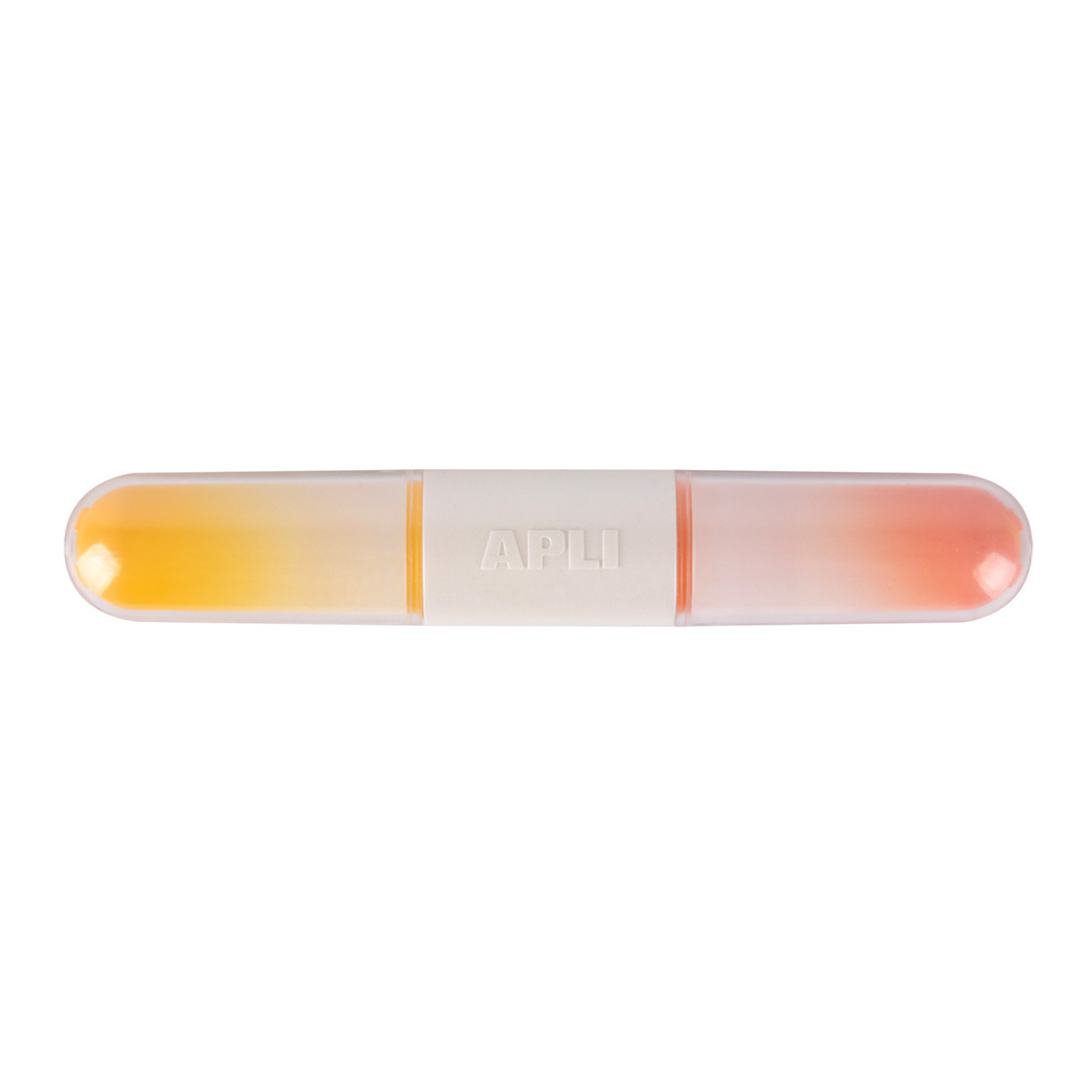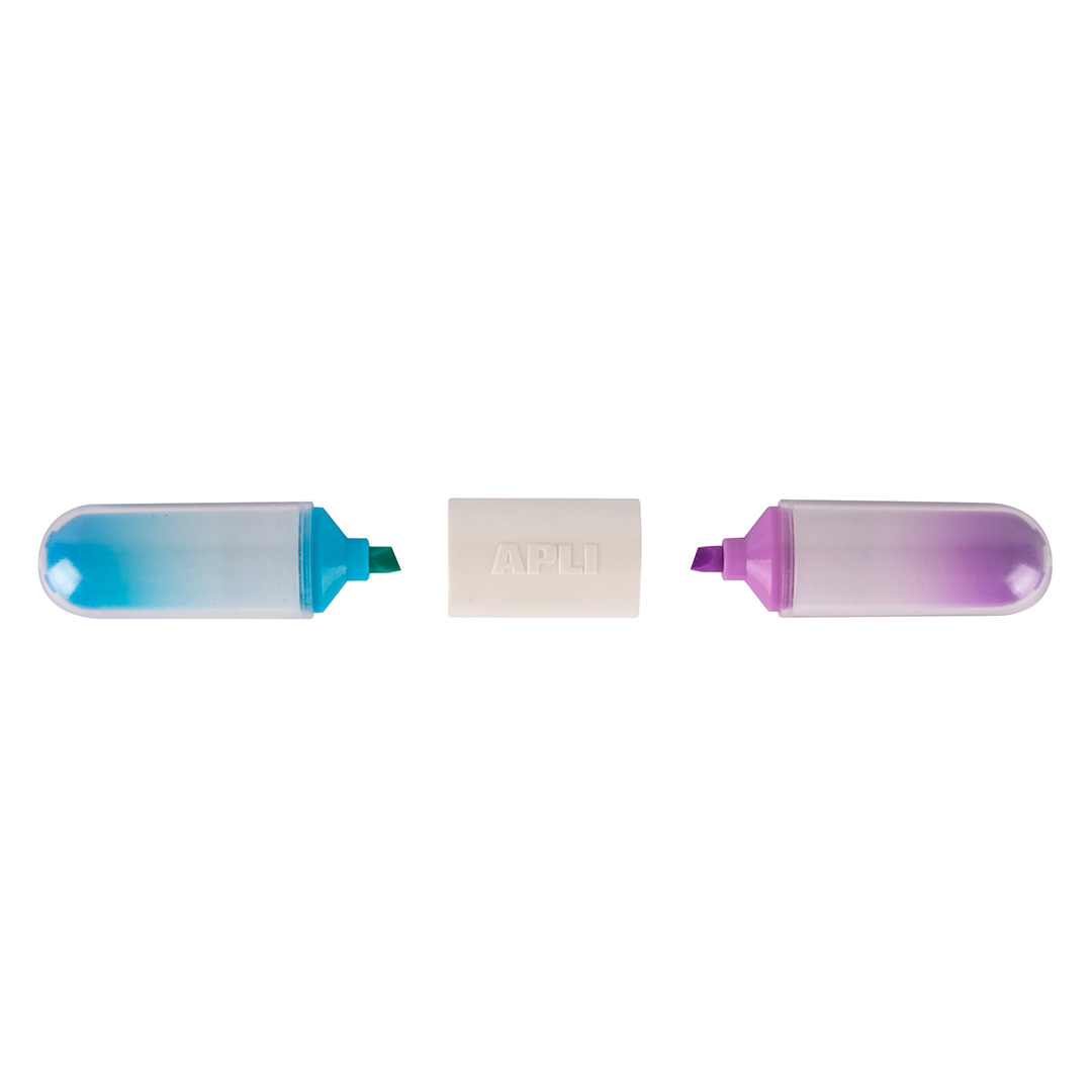 Chaque surligneur propose deux couleurs, une à chaque extrémité, avec une pointe biseautée. Le présentoir contient 36 surligneurs répartis en trois modèles assortis : bleu et lilas, jaune et orange, vert et rose.
