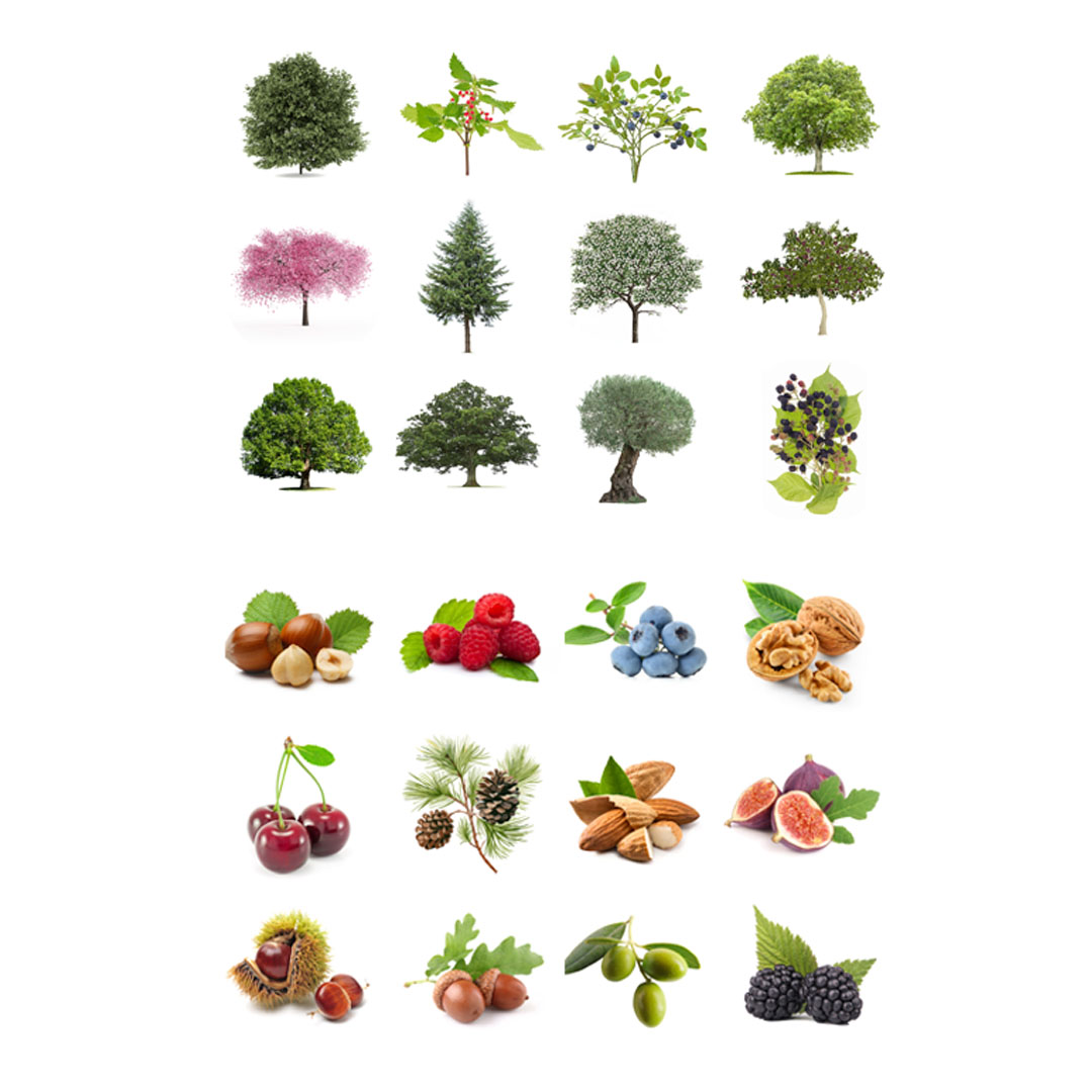 Rouleau de gommettes sur le thème des arbres Ø 33 mm en adhésif permanent. Chaque rouleau contient 30 feuilles prédécoupées pour une séparation facile, soit au total 360 gommettes avec des motifs différents : noisettier, noyer, amandier, châtaignier, chêne, figuier, cerisier, bleuet, framboisier, sapin, olivier, mûrier.