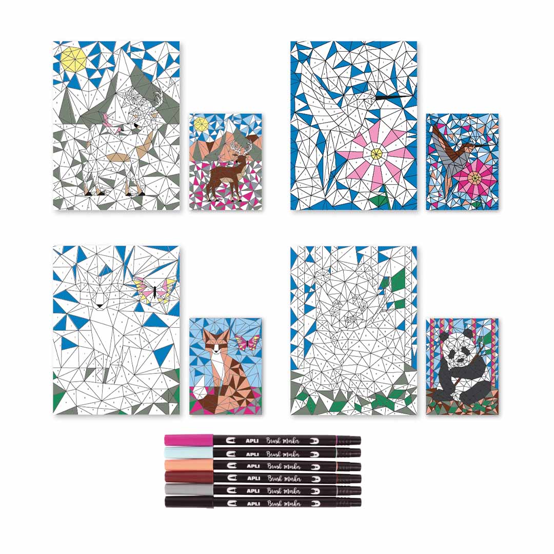 Contenu : 4 fiches illustrées avec des dessins différents, 6 marqueurs à double pointe (fine et pinceau), 4 fiches illustrées avec des exemples et 1 notice.