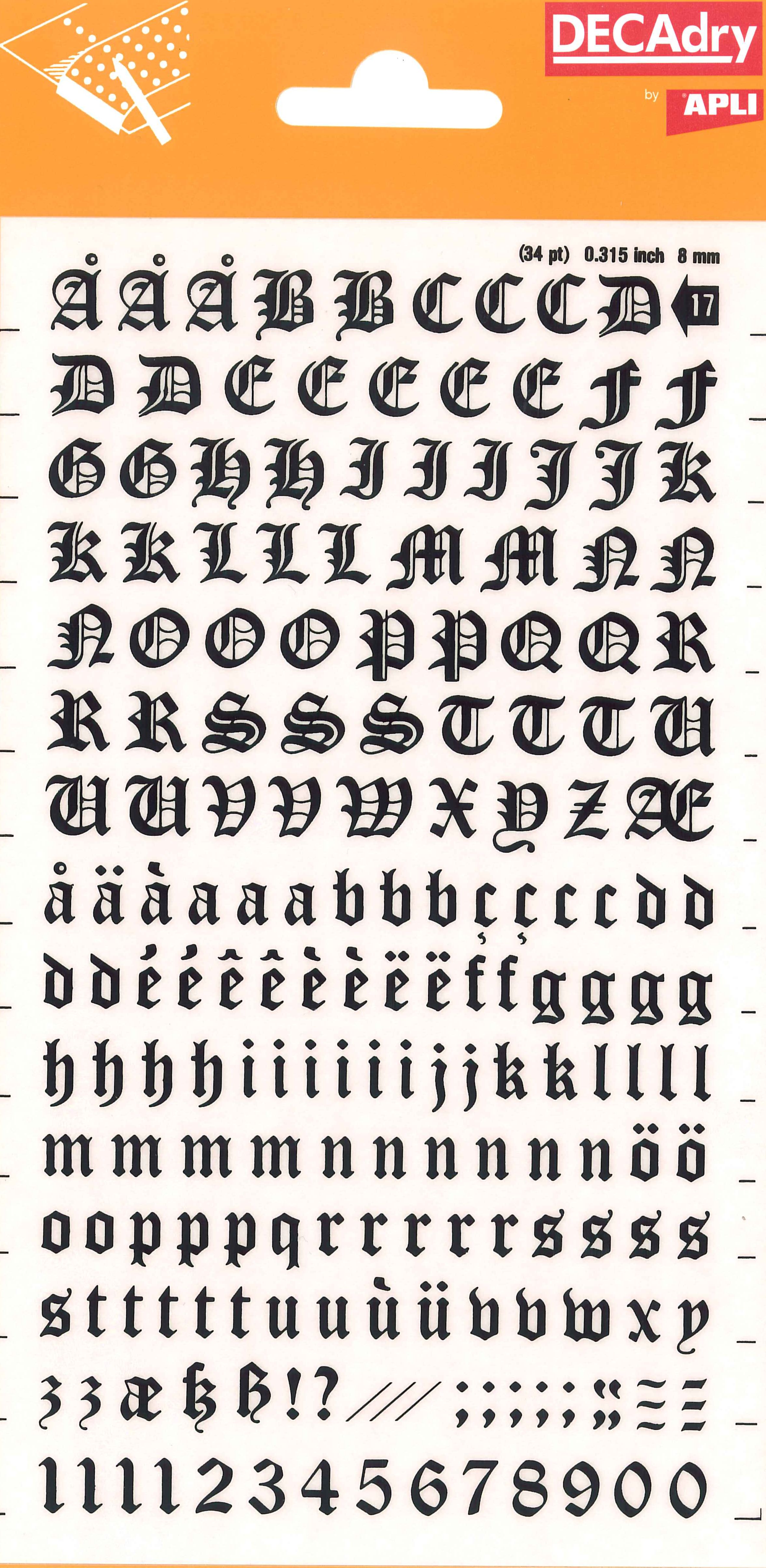 Lettres majuscules et minuscules de typographie ancienne et chiffres autocollants noirs de 8 mm de hauteur (34 pt). Chaque paquet comporte 1 feuille avec 199 caractères.