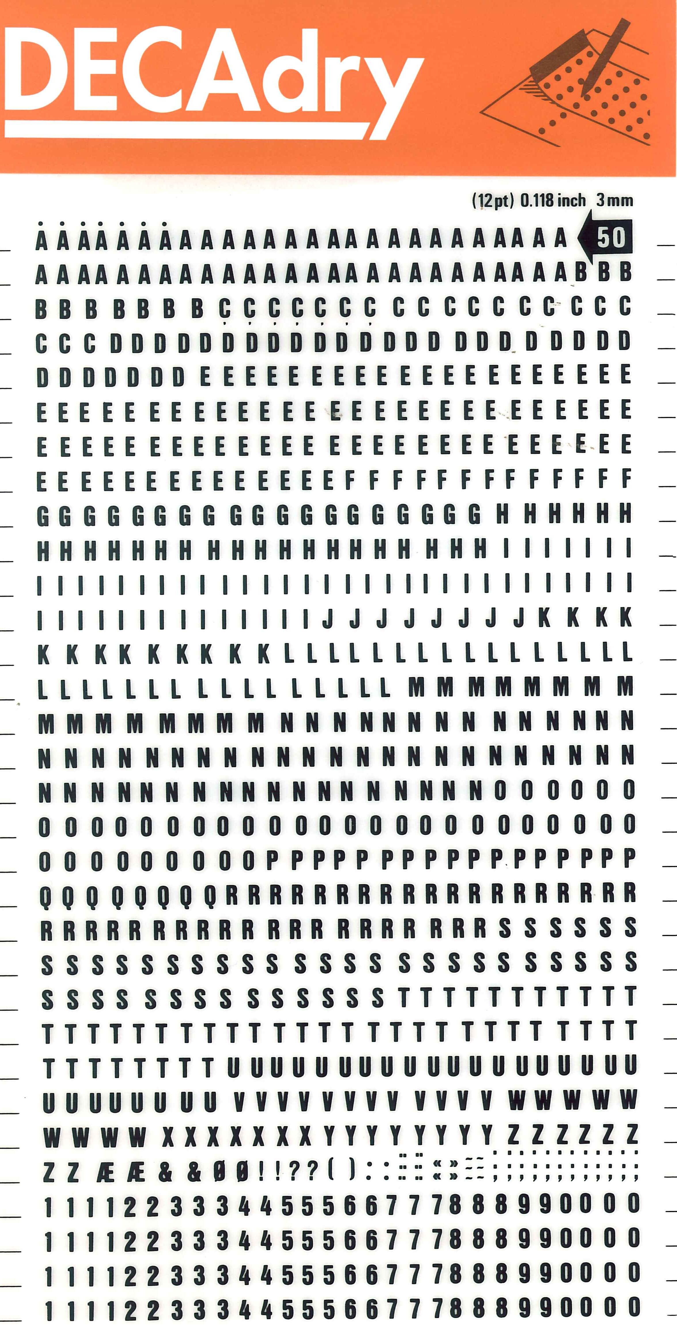 Lettres et chiffres autocollants noirs de 3 mm de hauteur (12 pt). Chaque paquet comporte 1 feuille avec 888 caractères.
