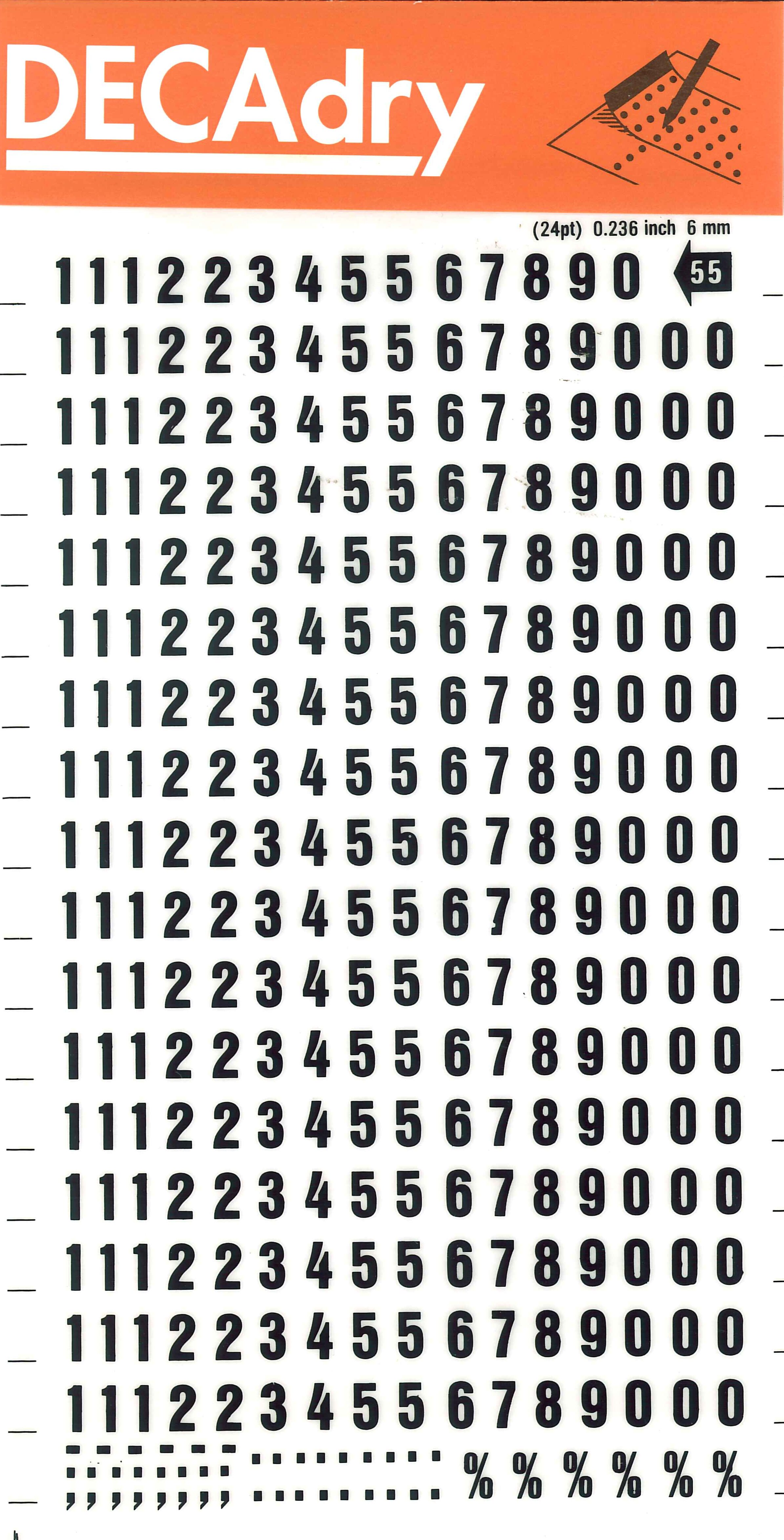 Chiffres autocollants noirs de 6 mm de hauteur (24 pt). Chaque paquet comporte 1 feuille avec 316 caractères.