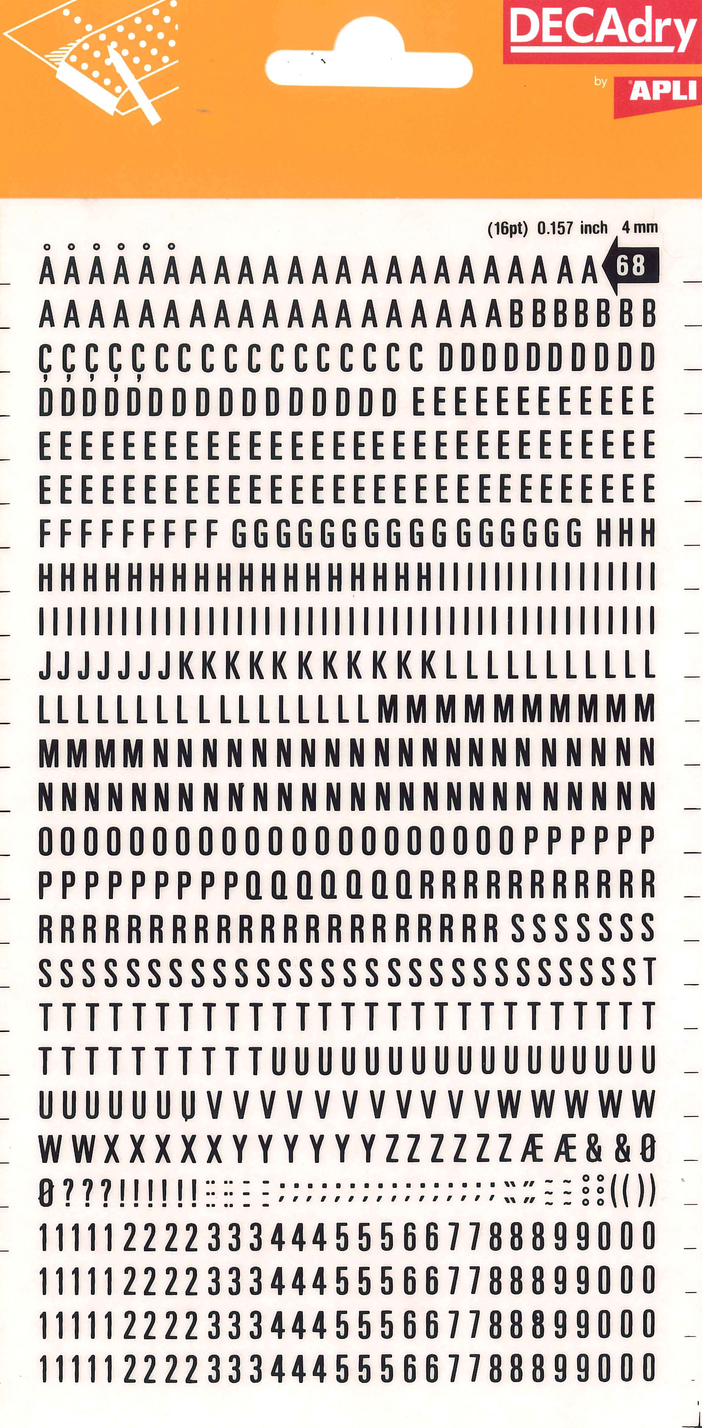 Lettres et chiffres autocollants noirs de 4 mm de hauteur (16 pt). Chaque paquet comporte 1 feuille avec 792 caractères.