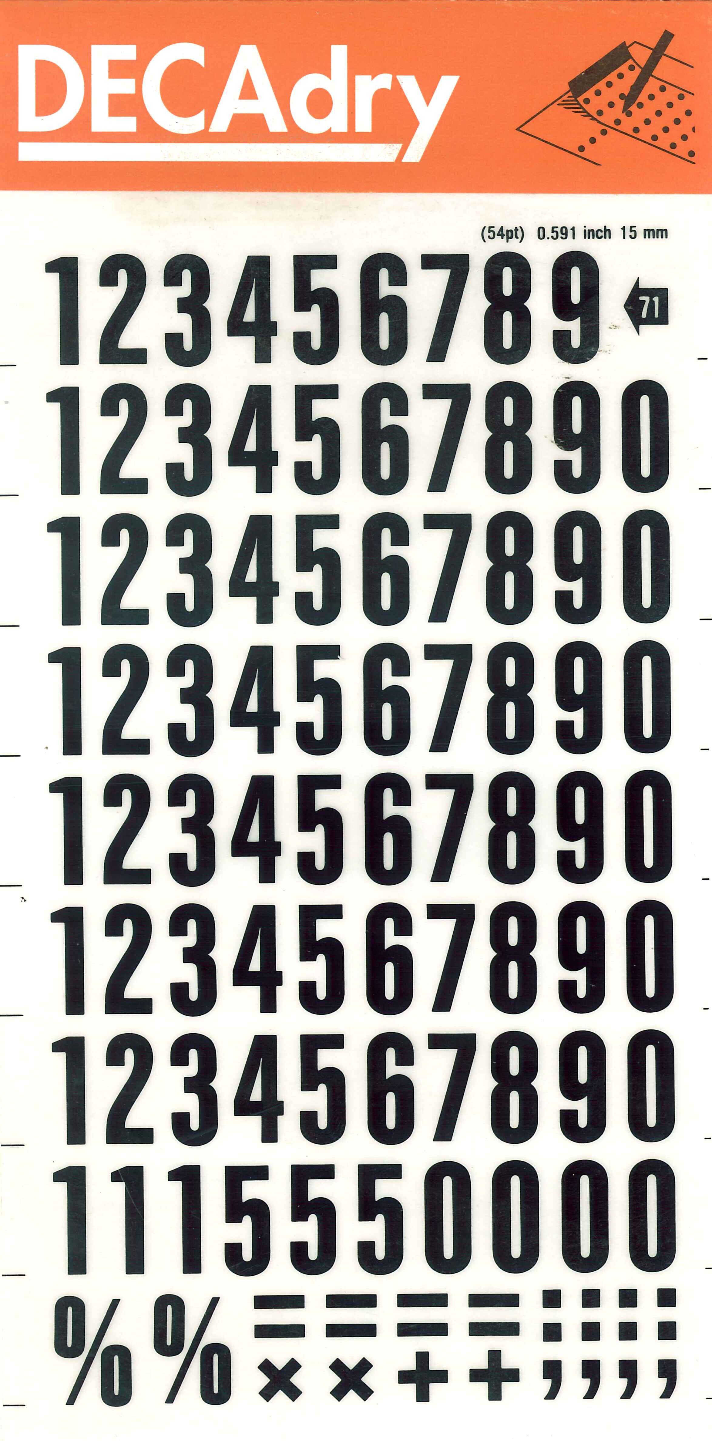Chiffres autocollants noirs de 15 mm de hauteur (54 pt). Chaque paquet comporte 1 feuille avec 105 caractères.