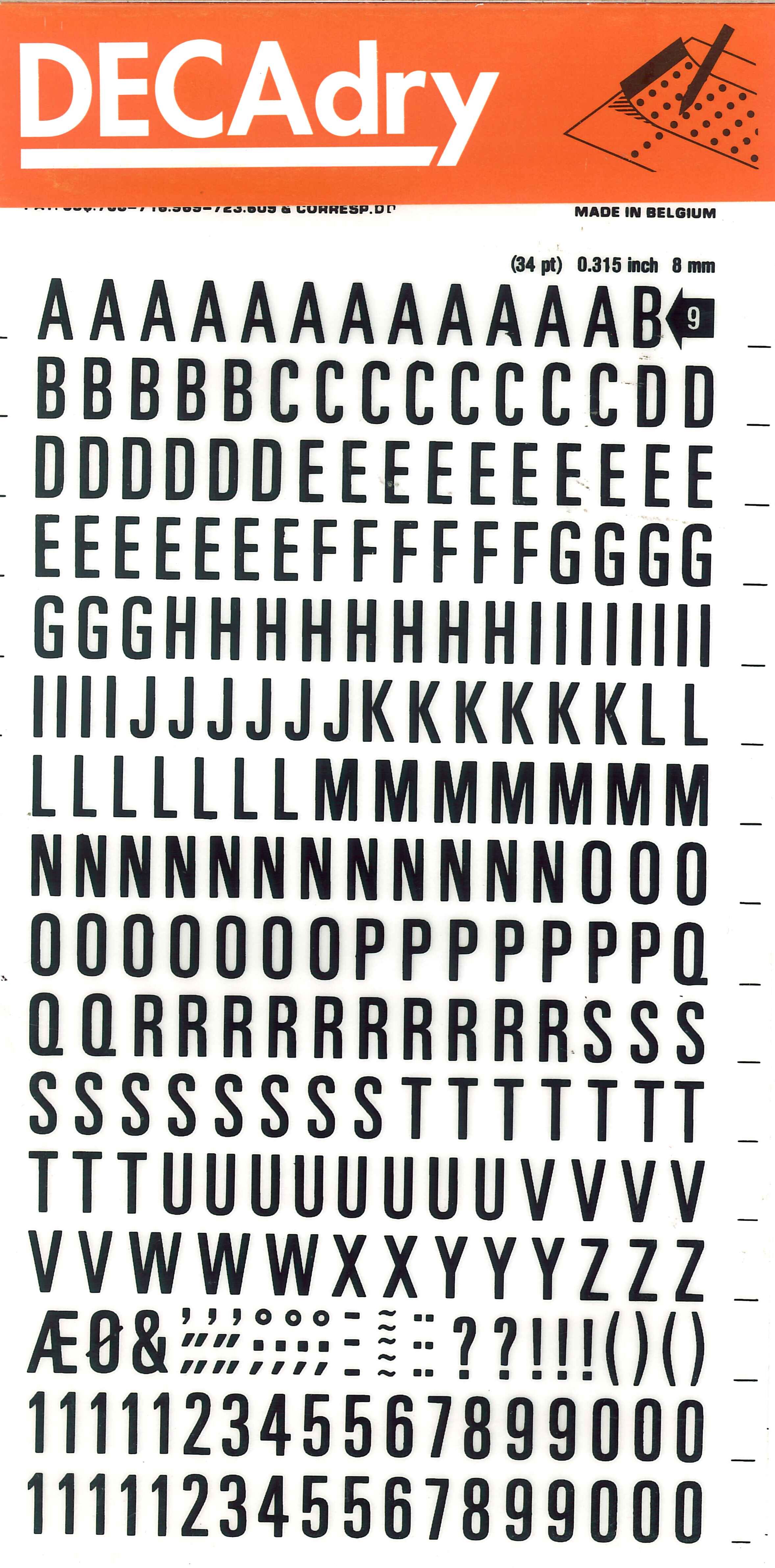 Lettres et chiffres autocollants noirs de 8 mm de hauteur (34 pt). Chaque paquet comporte 1 feuille avec 277 caractères.