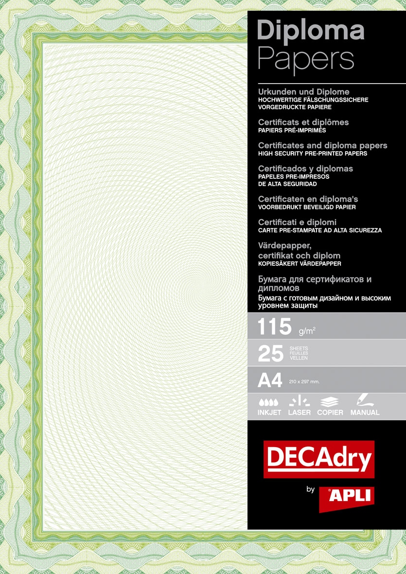 Papier pour certificat vert et bleu format A4. Papier de 115 g/m² avec motif de coquillage sur les bordures. Chaque paquet contient 25 feuilles.