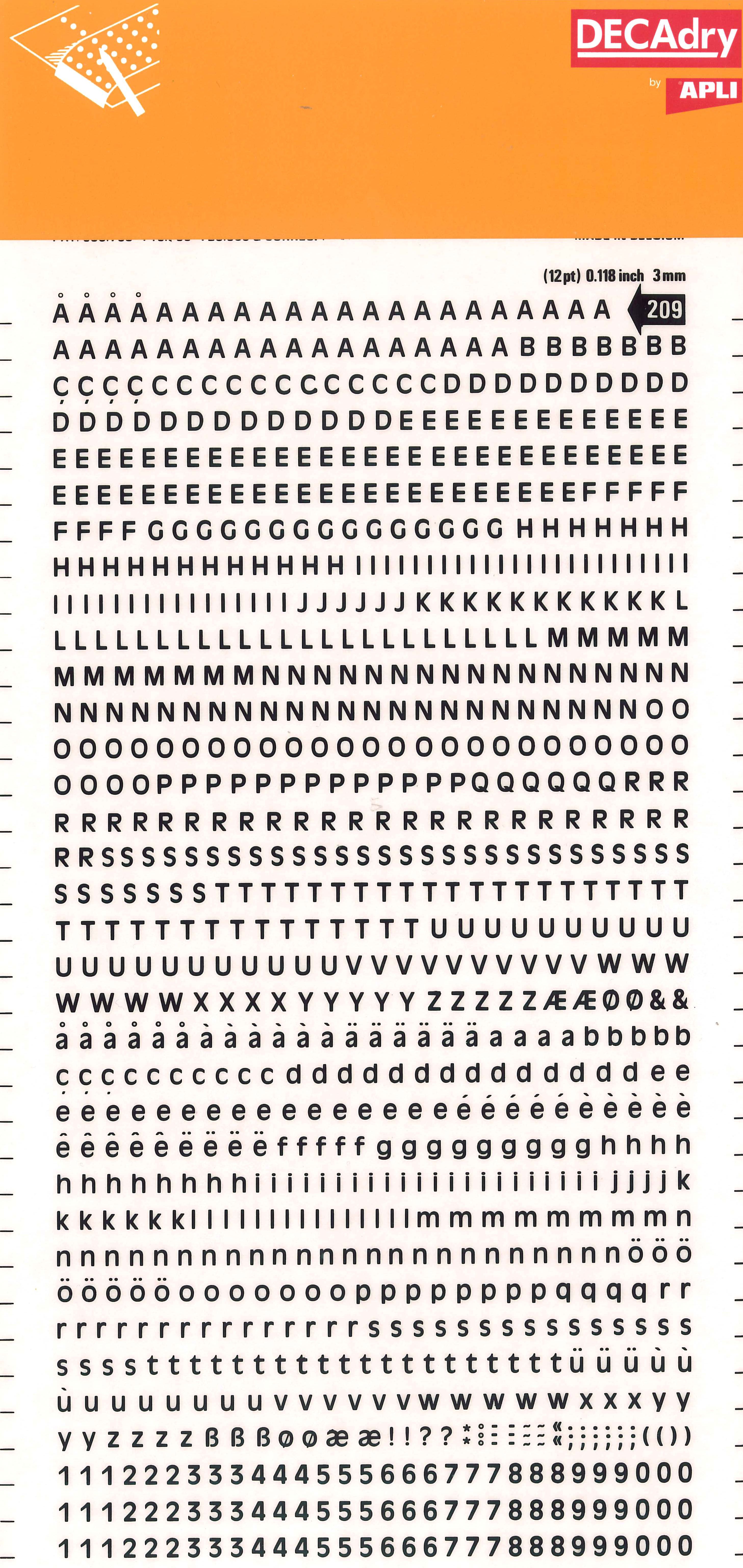 Lettres majuscules et minuscules et chiffres autocollants noirs de 3 mm de hauteur (12 pt). Chaque paquet comporte 1 feuille avec 997 caractères.
