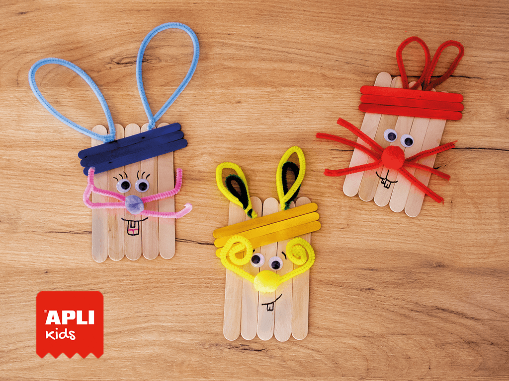 3. Décorez les lapins comme bon vous semble ! Collez-y des morceaux en carton pour créer les oreilles, le nez et les dents ; créez les moustaches avec des chenilles ; ajouter les yeux mobiles et finissez de les décorer avec des feutres.